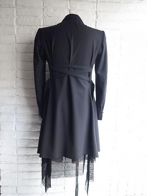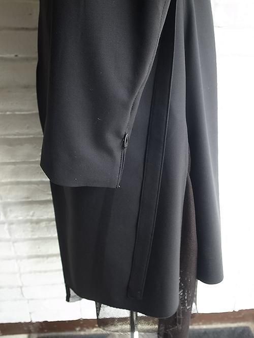 裏地が本体より長めになっている、レイヤードタイプのジャケットロングジャケット。