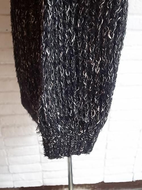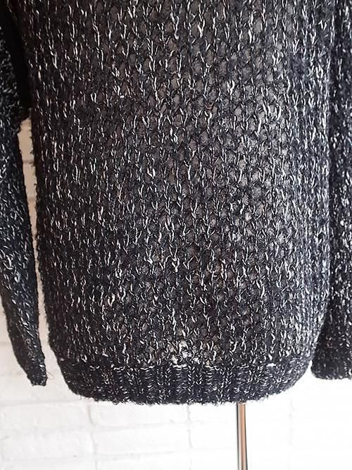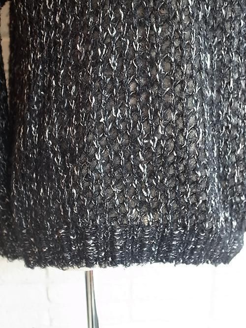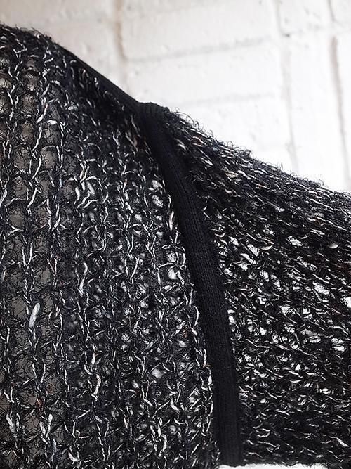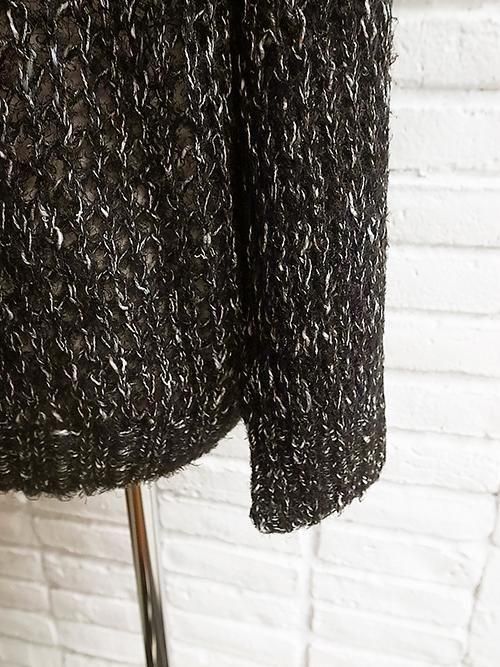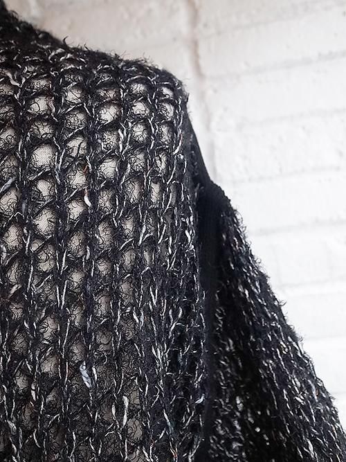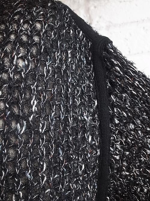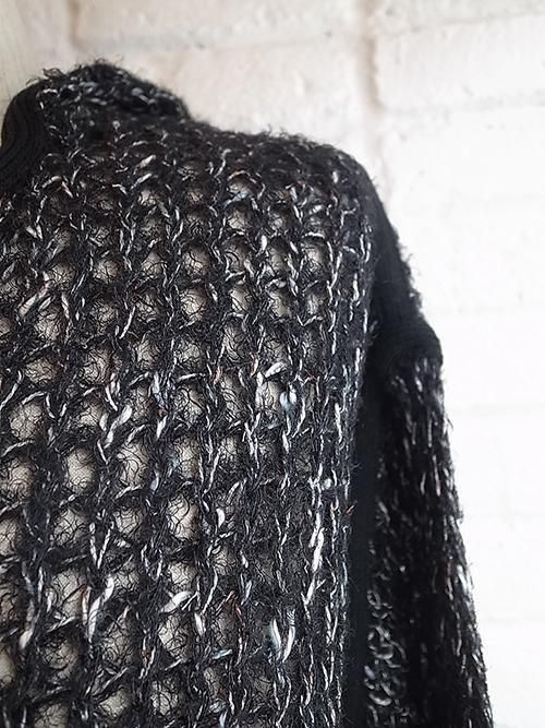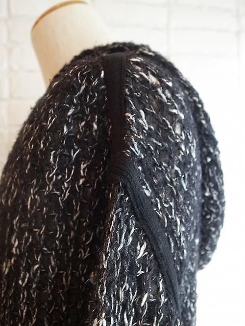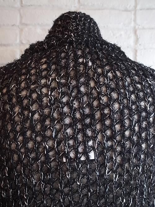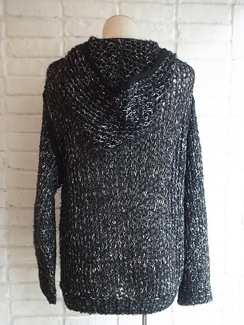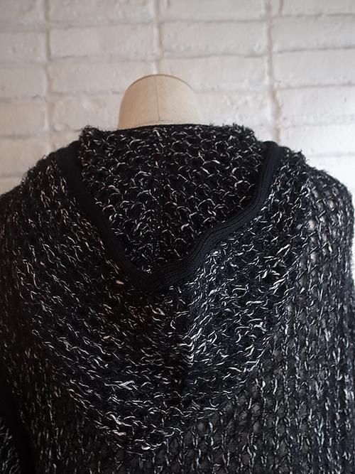 タック編みでメッシュを表現した、透かし編みニット被りのパーカータイプ。